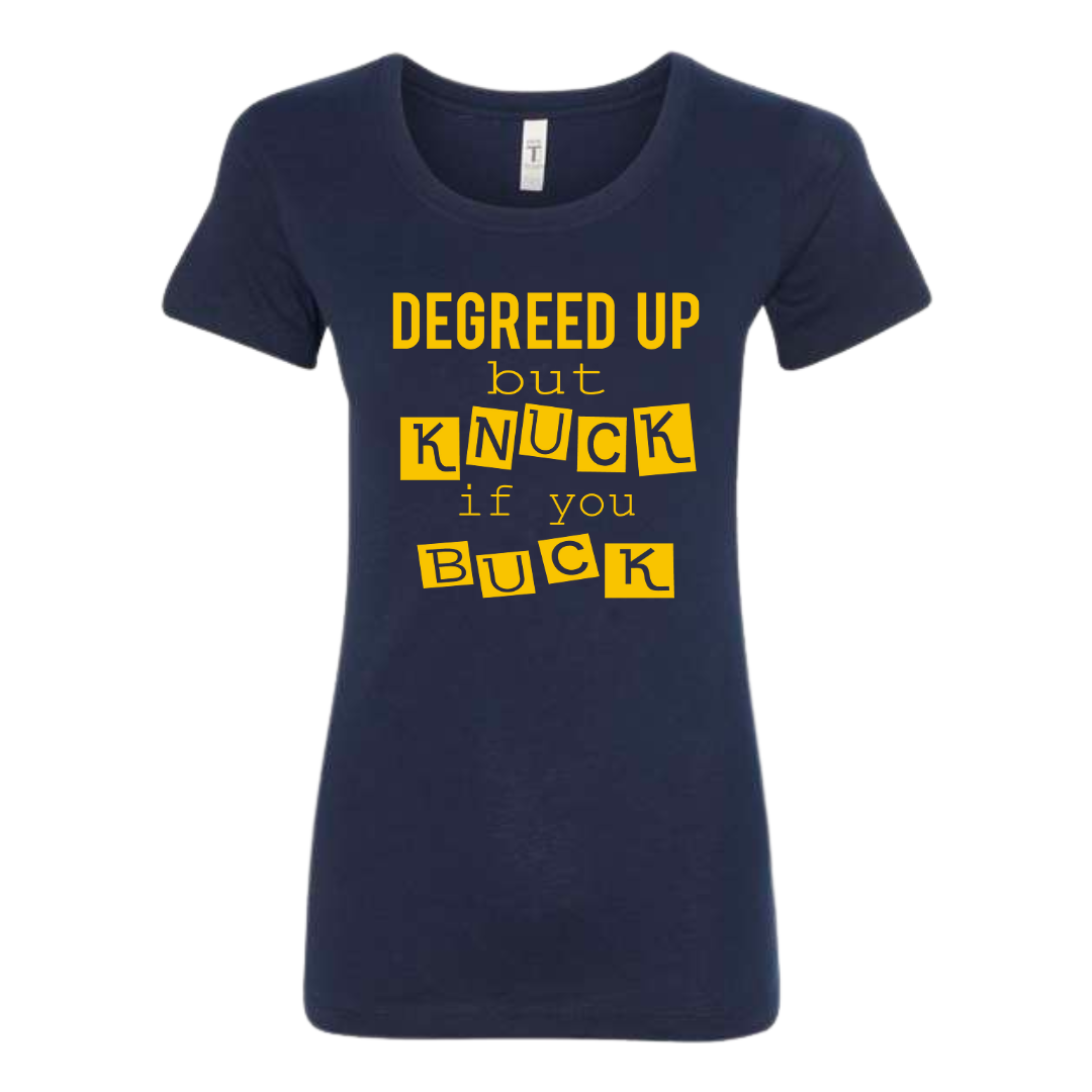 Degreed up, but KNUCK if you BUCK. You know what I'm talking about. You have folks who want to test you, because they forgot you're from the hood and you grew up on Knuck if You Buck. Little do they know, you've got degrees, but you've still got them hands, too. Let them know with this tee.