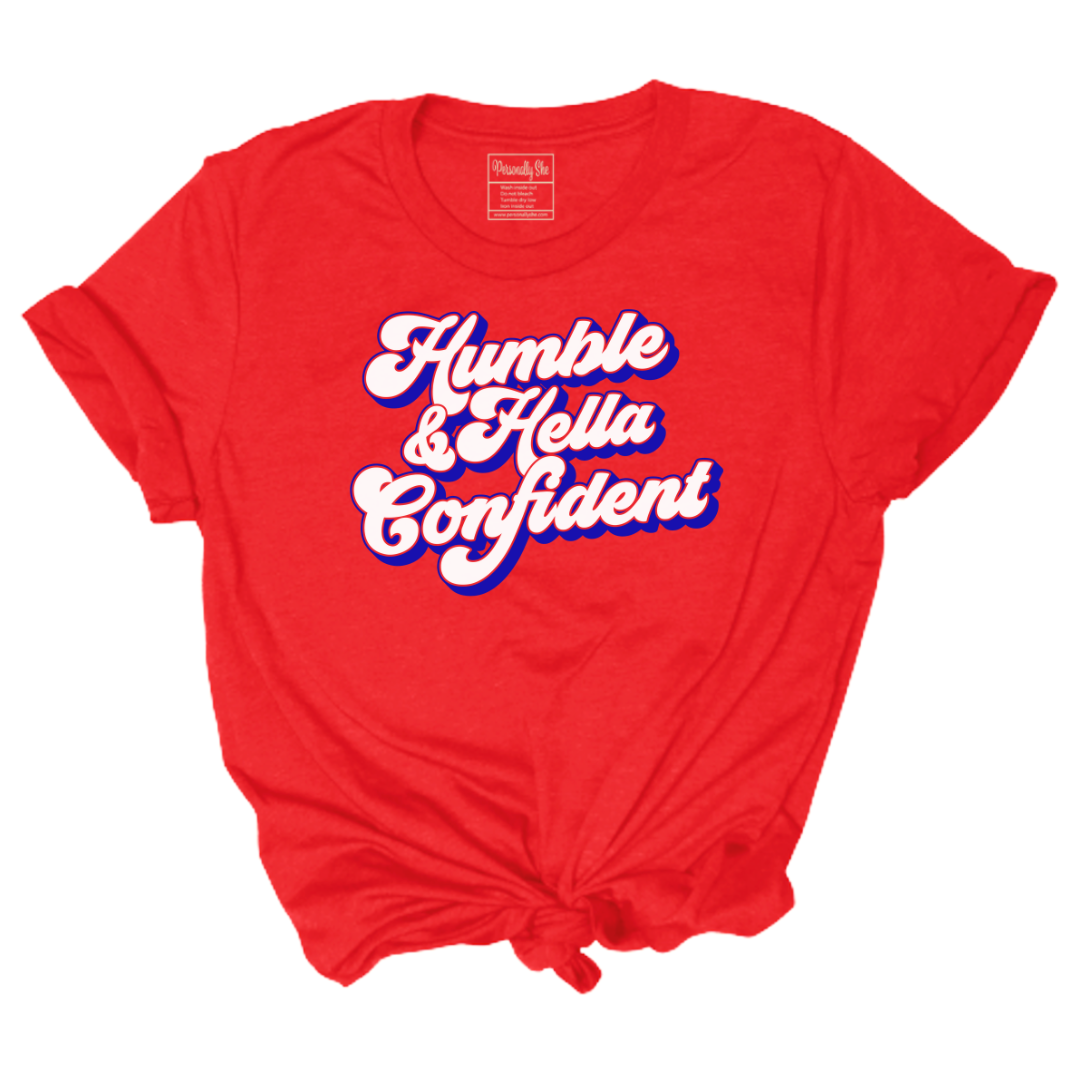 The red t-shirt with the bold lettering, "Humble and Hella Confident," is a reminder that you can be both of these things simultaneously. It's a reminder that humility does not mean self-doubt, and confidence does not mean arrogance. We encourage you to embrace both and let everyone know you're Humble & Hella Confident!