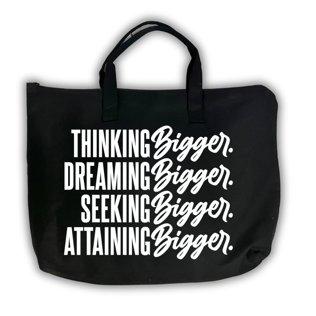 Show the world that you're always Thinking Bigger, Dreaming Bigger, and Seeking Bigger to attain even greater success.. Click 'Add to Cart' and grab this tote bag now.