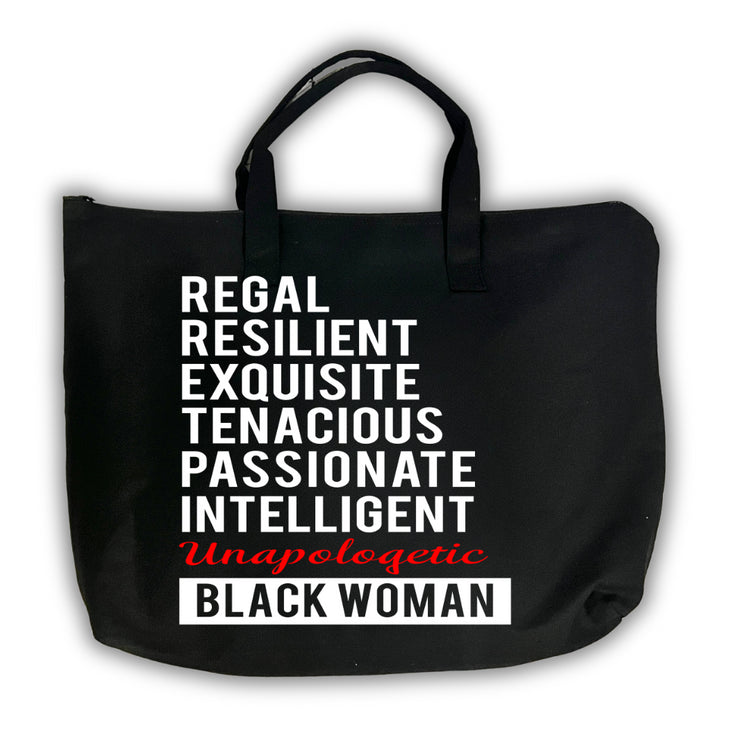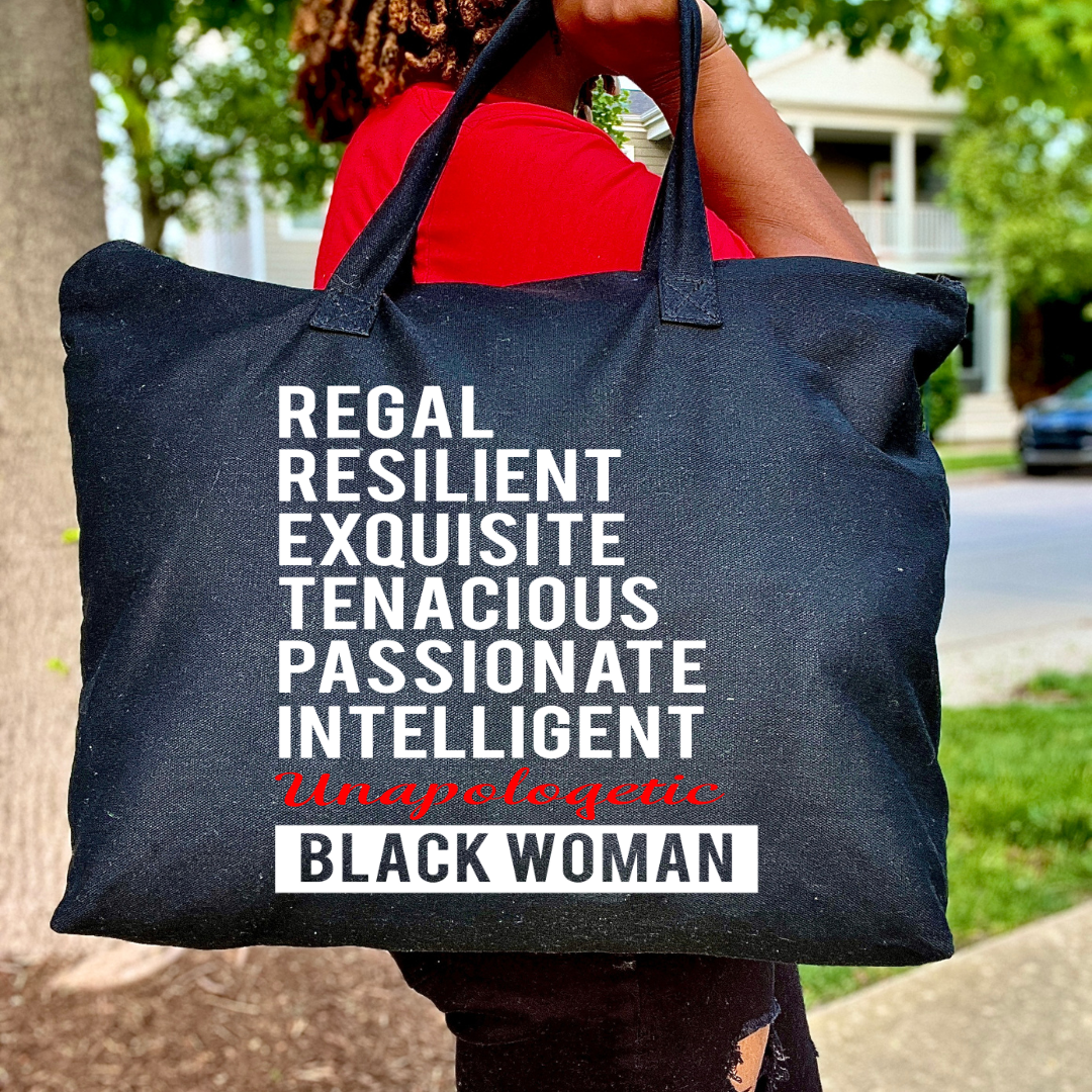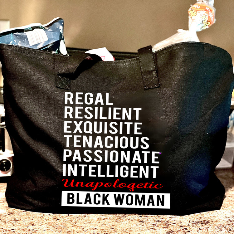 Imagine the attention you'll get and the conversations you'll start while carrying this statement tote. It features the words "Regal, Resilient, Exquisite, Tenacious, Passionate, Intelligent, Unapologetic Black Woman," to describe the unique and powerful qualities Black women possess.