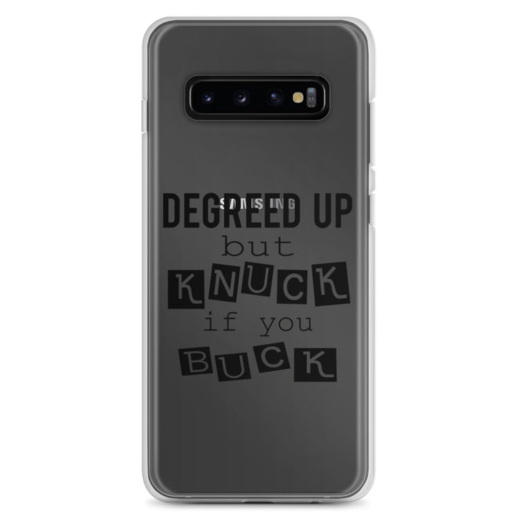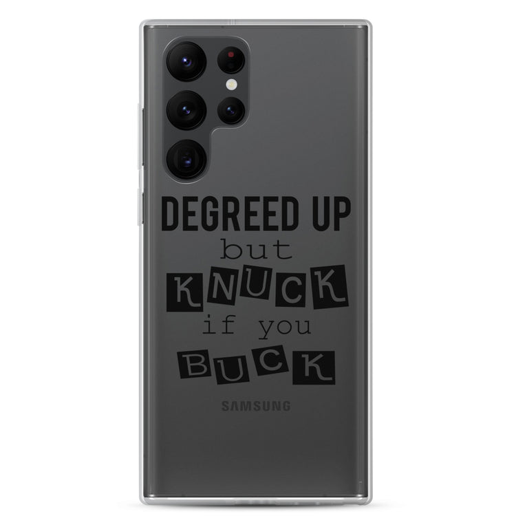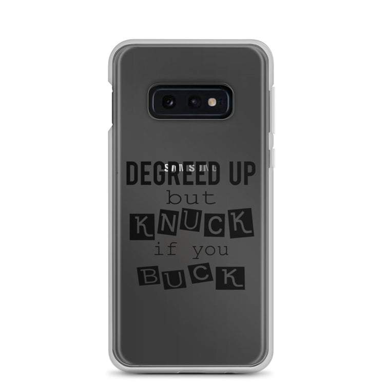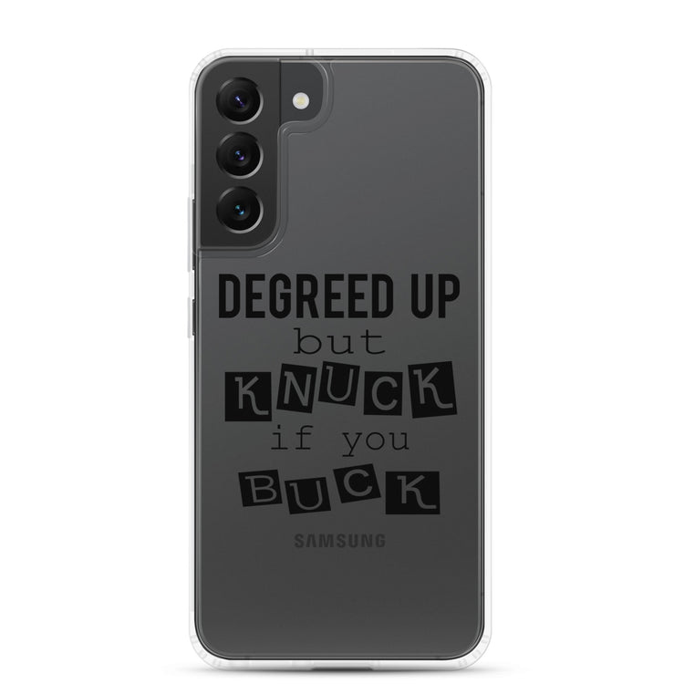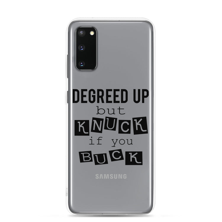 Looking for a phone case that makes a statement? This Degreed Up But Knuck If You Buck clear Samsung case makes a statement and provides maximum protection for your device against scratches, dings, and other daily wear and tear. The precise cutouts allow easy access to all ports, buttons, and cameras, so you can capture every moment without removing the case.